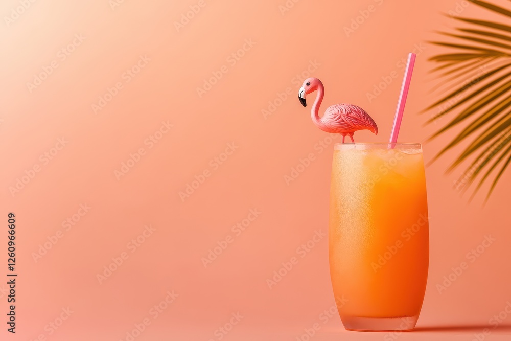 • Refreshing drink adorned with a quirky flamingo stirrer against a vibrant coral background