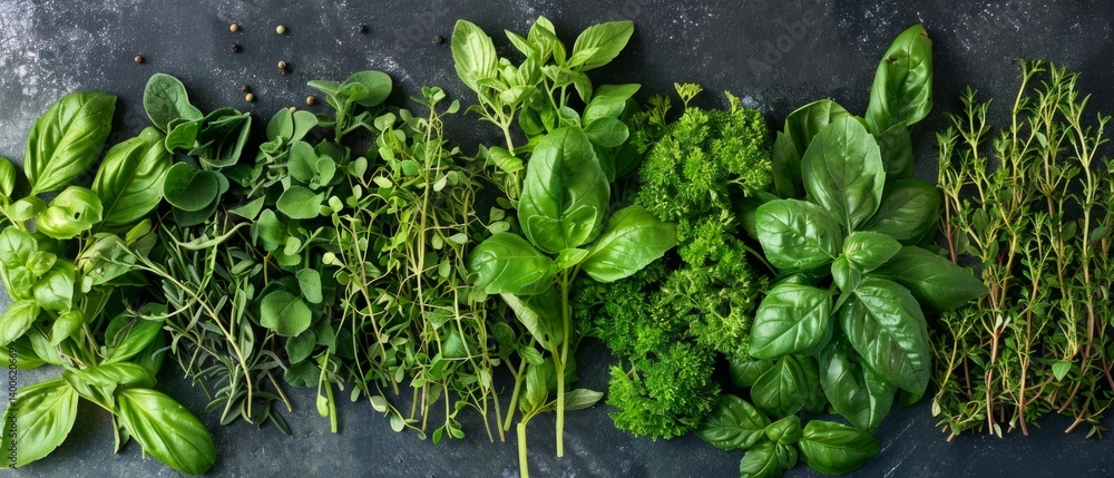 • Fresh green herbs and spices on a dark background. Perfect for cooking blogs, recipes, healthy eating.