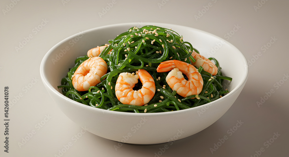 Fototapeta do Restauracji - Appetizing Shrimp And Seaweed Salad In White Bowl Ready For Consumption #1426041078