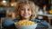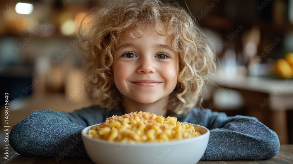 Fototapeta do Restauracji - Young child with curly hair smiles behind a bowl of macaroni and cheese. #1438715840