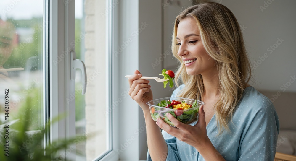 Fototapeta do Restauracji - Smiling woman eating a salad from a plastic container by the window #1442107942