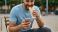 • A man happily eating food while looking at the phone.