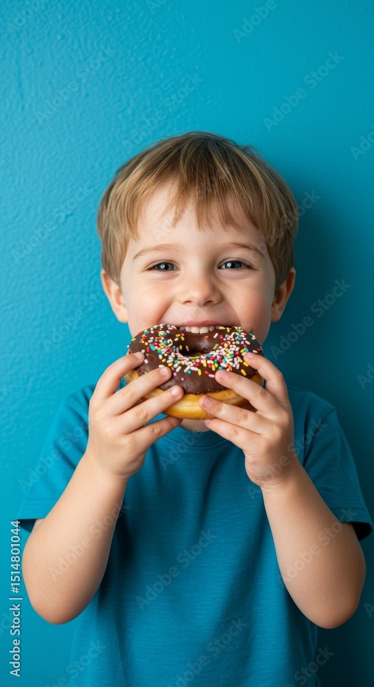 • Photo of a Boy Eating Donut with Sprinkles in front of Blue Backdrop