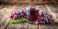 • Fresh glass of purple grape juice on a wooden table, with a few grapes and a sprig of rosemary in the background