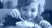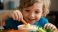 • Adorable Toddler Enjoying Healthy Snack Carrots, Broccoli, and Hummus