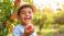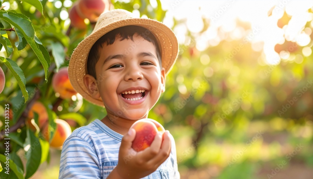 Fototapeta do Restauracji - Happy child eating a peach in the garden. #1534133325