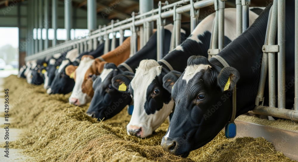 Fototapeta do Restauracji - Holstein dairy cows eating fresh hay in a modern barn with sunlight filtering through open sides #1542936345