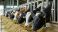• Holstein dairy cows eating fresh hay in a modern barn with sunlight filtering through open sides