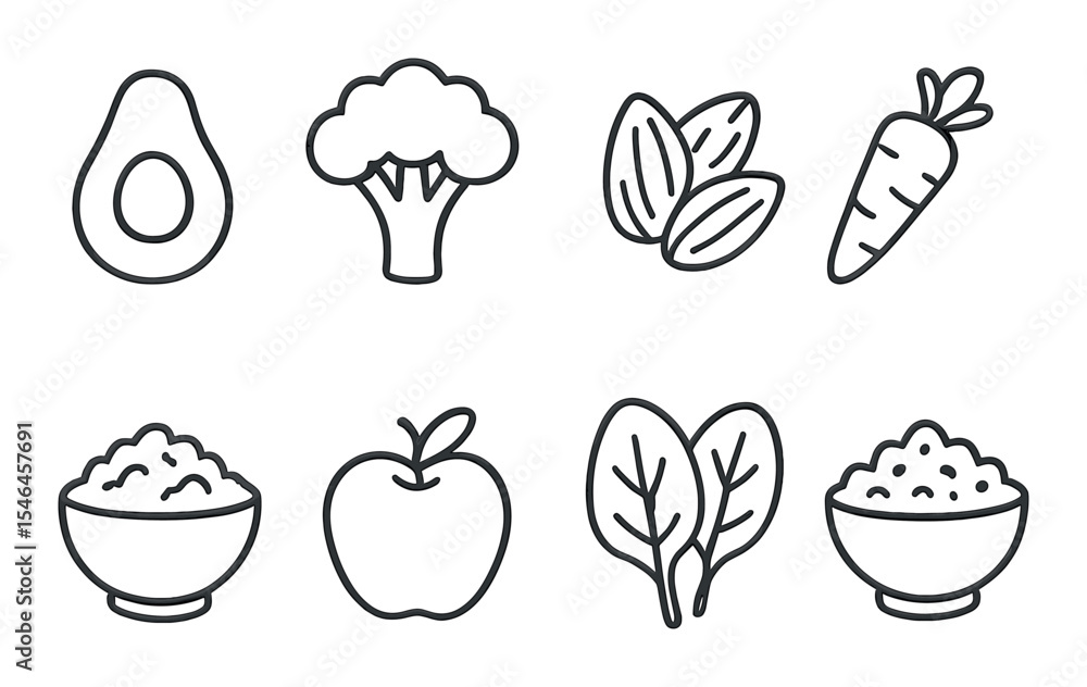 • Healthy food icons set – linear, simple nutrition and wholesome diet symbols
