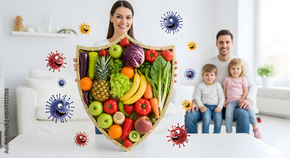 • Family holding shield of fruits and vegetables, protecting from germs, healthy lifestyle, immunity boosting, disease prevention, wellness concept