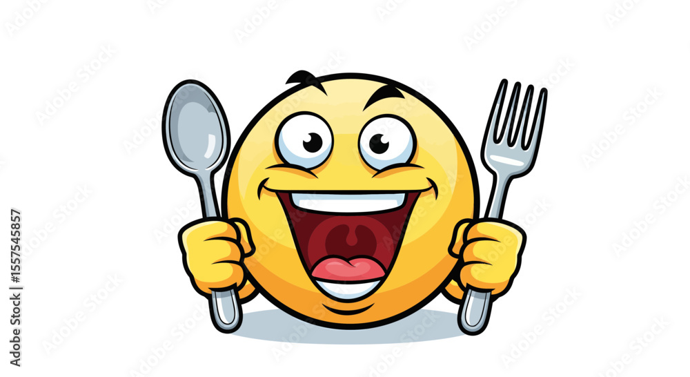 • Hungry Emoji Cartoon Character Holding a Spoon and Fork Isolated on White Background