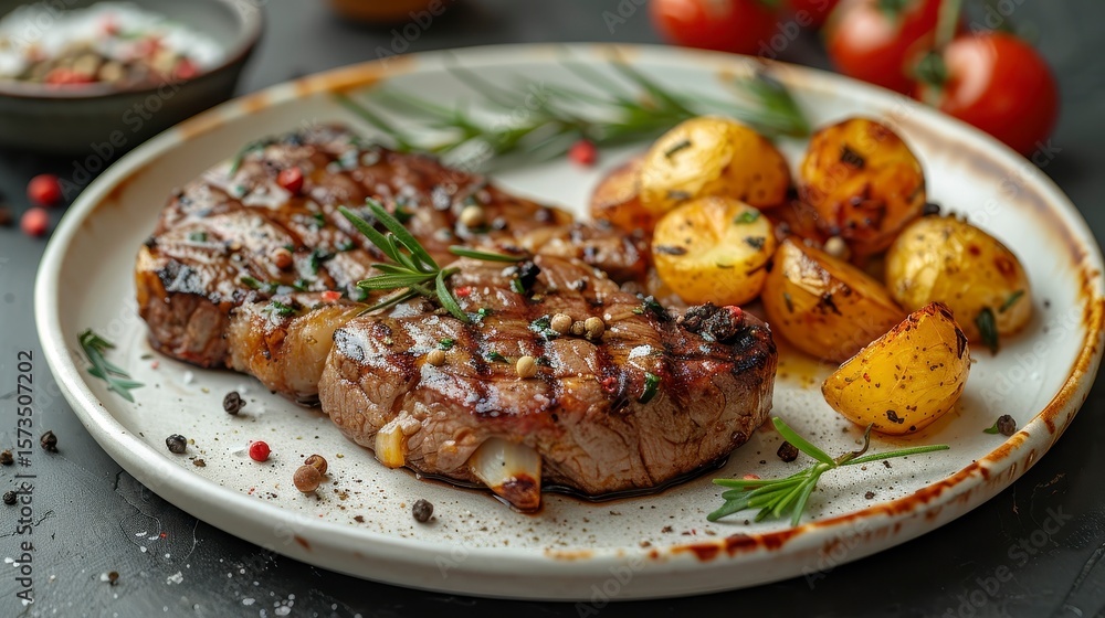 • Grilled steak with potatoes and rosemary on a plate against dark grey