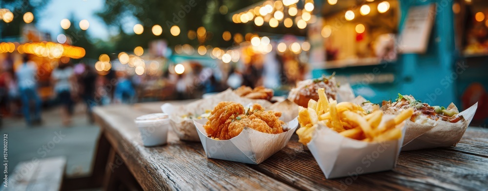 • Food truck serving assorted dishes in white paper cups, fries on a wooden table, with people and colorful festival lights blurred in the background.