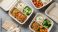 • Balanced meal prep containers showcasing grilled chicken, rice, vegetables, and wooden cutlery for healthy eating
