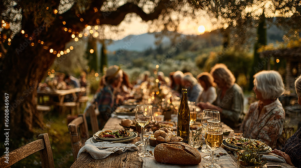 Fototapeta do Restauracji - Ferragosto celebration in the Italian countryside, large table set under olive trees, family and... #1600846967