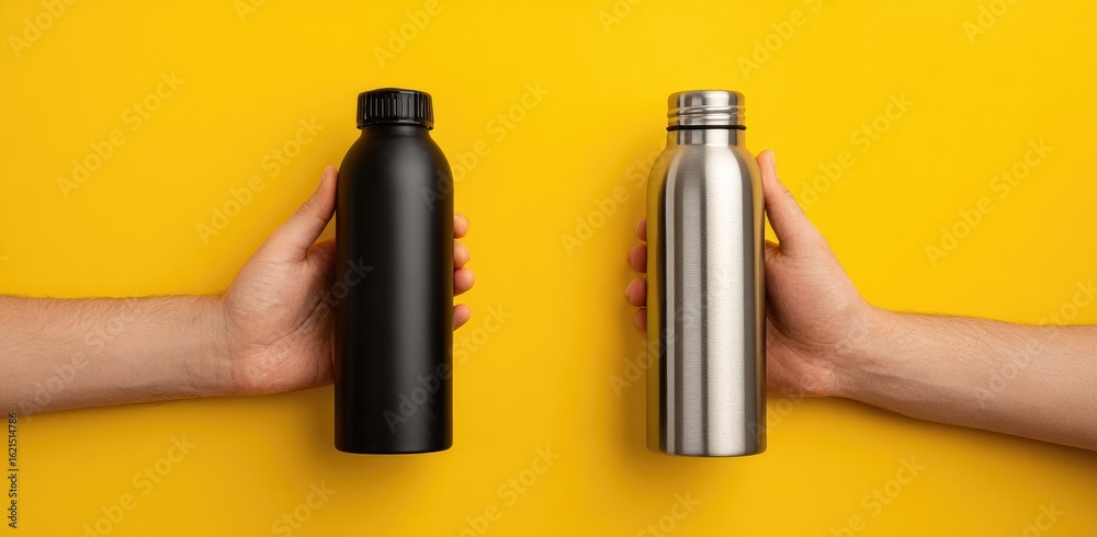 Fototapeta do Restauracji - Two reusable water bottles, one black and one silver, held by hands against a bright yellow... #1621514786