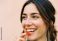 • Happy woman eating a star-shaped gummy vitamin supplement.