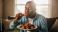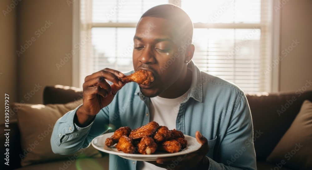 Fototapeta do Restauracji - A man happily eating delicious fried chicken wings indoors at home. #1639207927