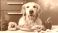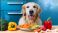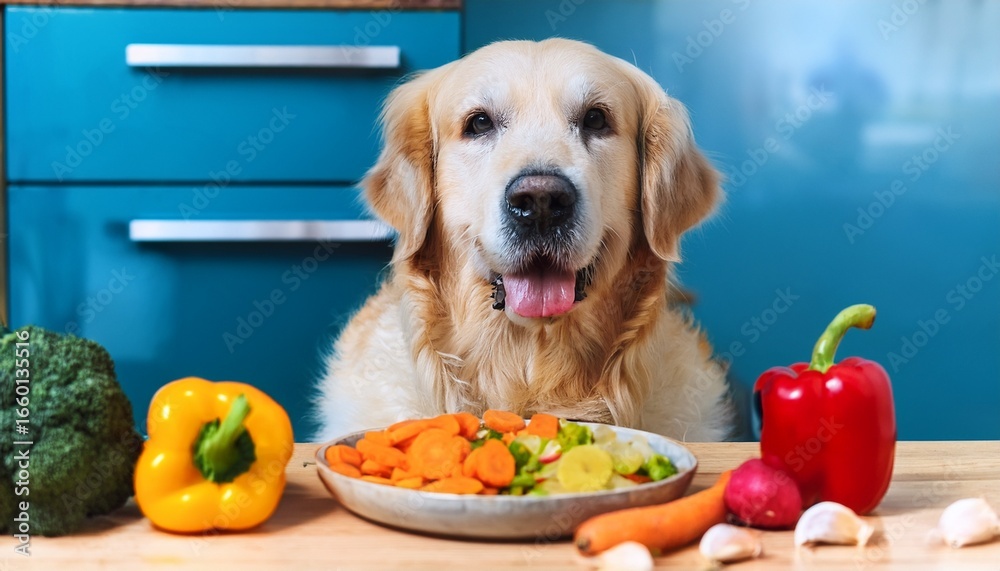• golden retriever looks at table with colorful food in cozy kitchen dog head tilted tongue out eating healthy food with variety of vegetables food on table includes bell peppers rice carrots