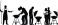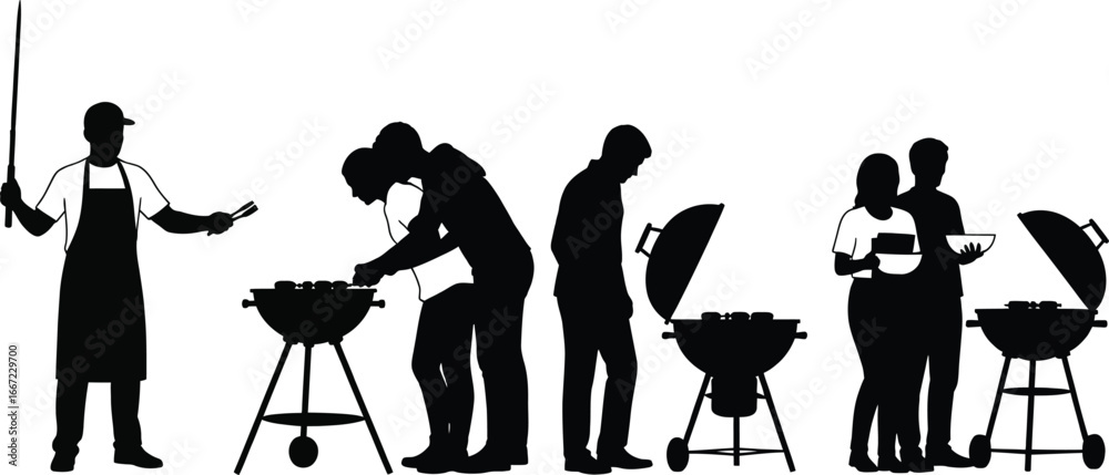 • Silhouettes of people at a barbecue with grills and food preparation cooking