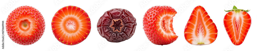 Fototapeta do Restauracji - Strawberry set including whole, halved, sliced, and bitten forms isolated. Fresh and dried fruit... #1670669944