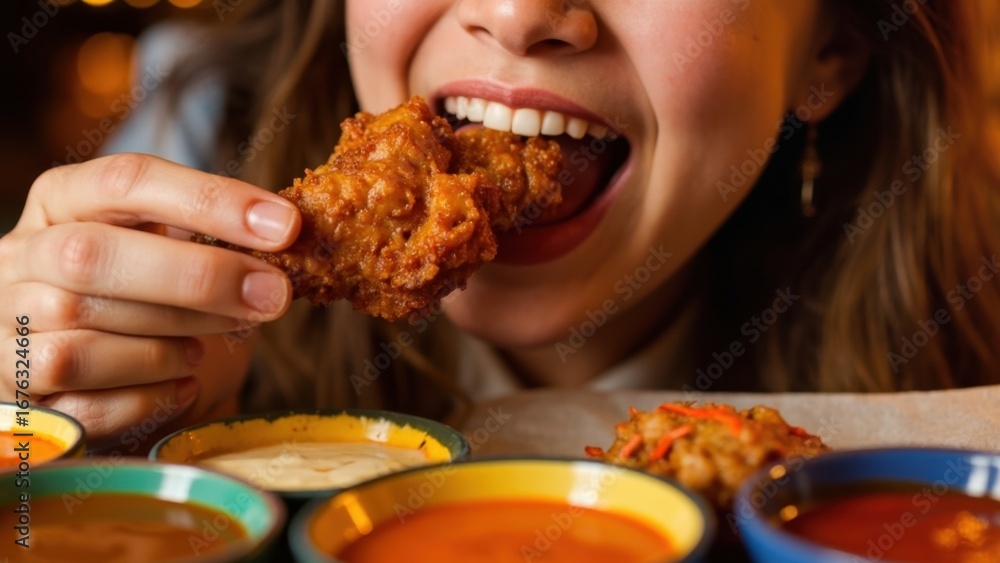 Fototapeta do Restauracji - Woman eating fried chicken with various sauces #1676324666