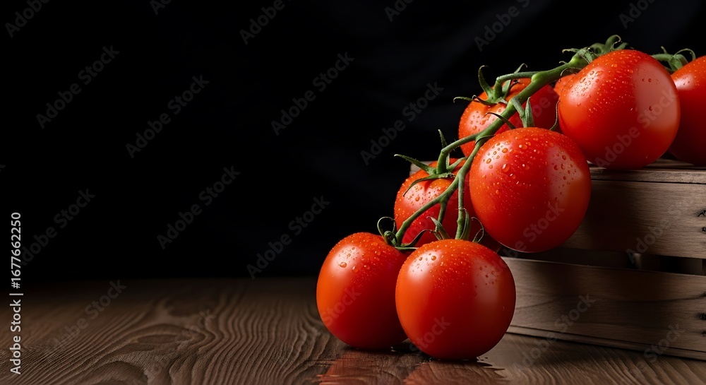 • Fresh ripe red tomatoes on stems grouped together for a healthy food still life