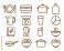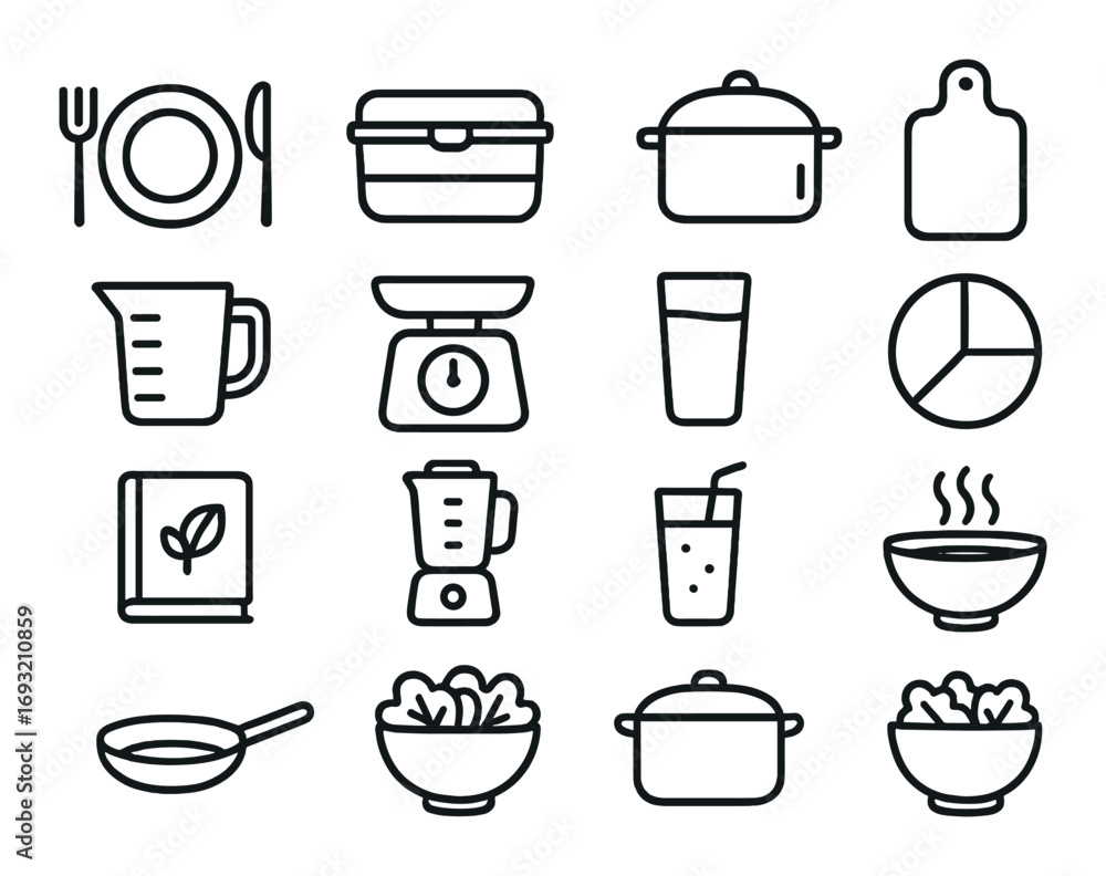 • Cooking tools linear icon set. featuring plate, lunchbox, pot, cutting board, measuring cup, and scale symbols.