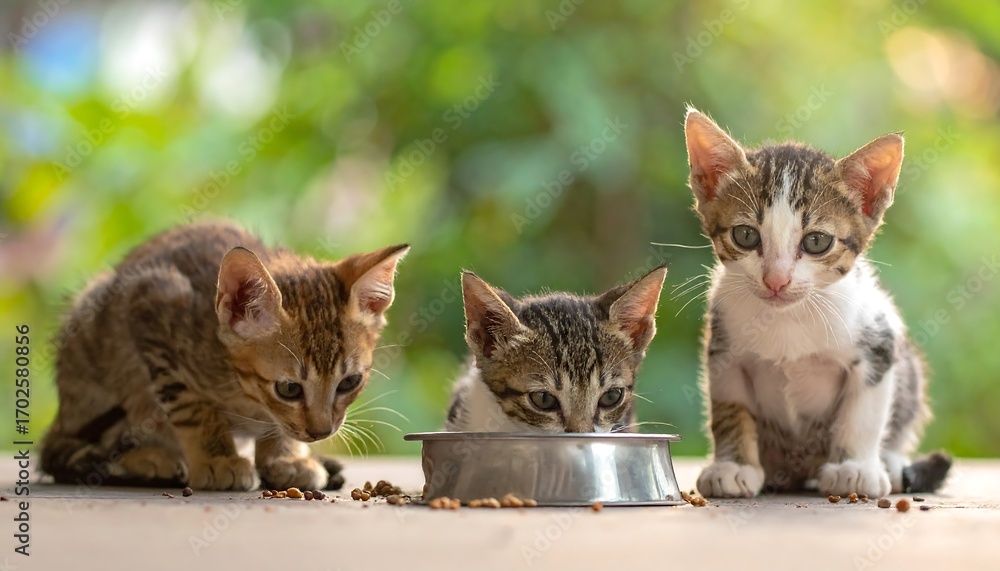 Fototapeta do Restauracji - Three kittens eating from a bowl outdoors #1702580856