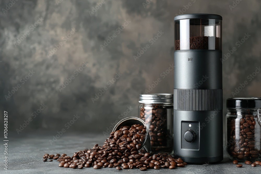 Fototapeta do Restauracji - Coffee beans, electric grinder, and jars on a dark textured background with copy space #1706828217