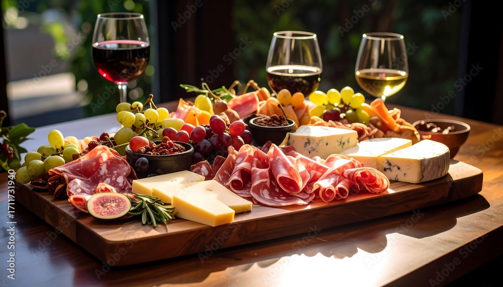 Fototapeta do Restauracji - Gourmet charcuterie board with wine #1711731940