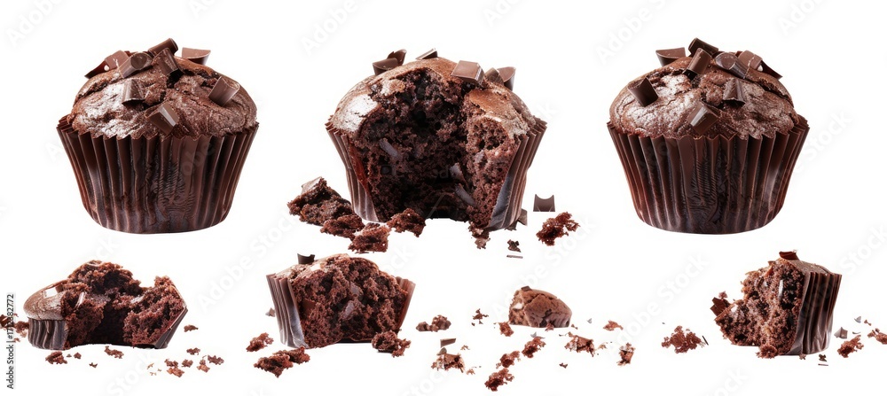 • From left to right, the top row features three chocolate muffins, each depicted in various stages of being eaten. The middle and bottom rows feature broken or half-eaten chocolate baked goods