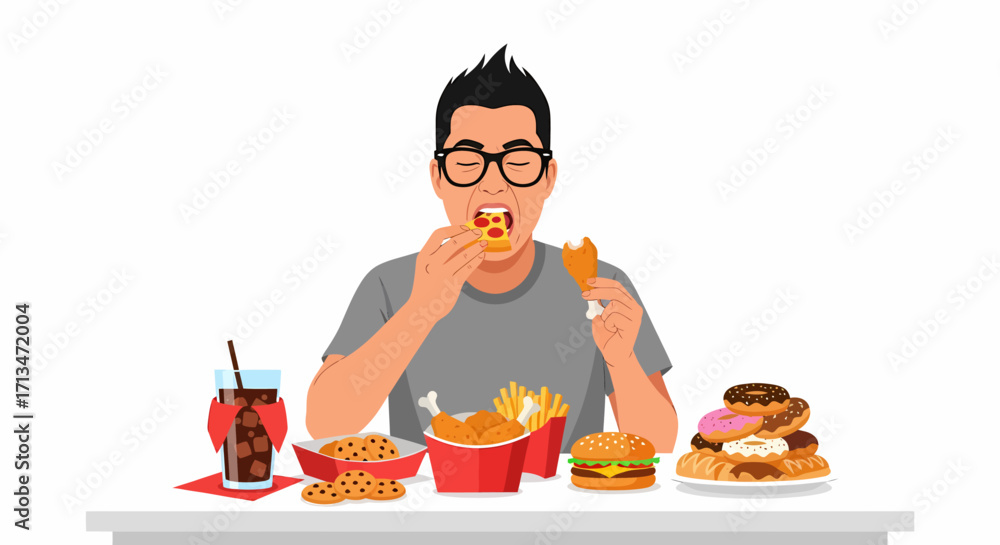 Fototapeta do Restauracji - A person with glasses eating fast food, surrounded by various unhealthy food items. #1713472004