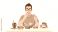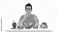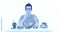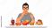 • A person with glasses eating fast food, surrounded by various unhealthy food items.