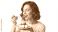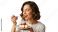 • Woman enjoying a delicious slice of cheesecake with berry topping, isolated on transparent background