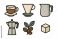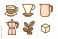 • Collection of coffee brewing accessories, hot beverage cup, raw beans, and sugar cube for morning drink preparation