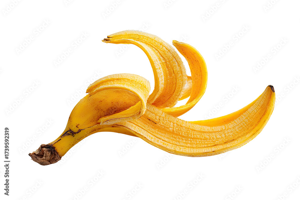 Fototapeta do Restauracji - A vibrant yellow banana peel against a stark black background, showcasing its peeled form #1739592319