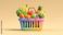 • Colorful rainbow shopping basket, cheerful with fresh fruits and vegetables, healthy eating concept