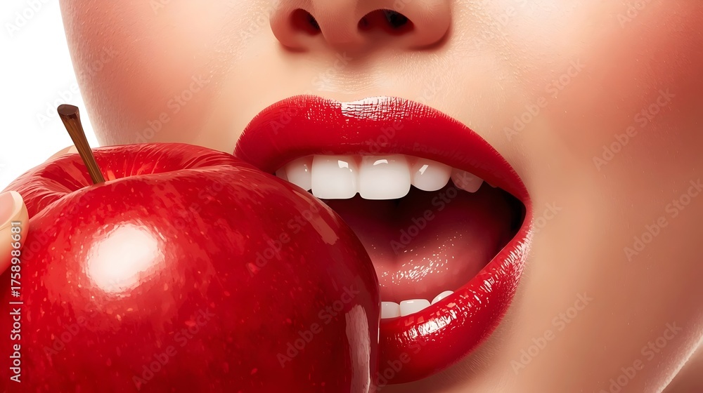 Fototapeta do Restauracji - Woman eating a red apple on National Eat A Red Apple Day, fresh, natural, and healthy #1758986681