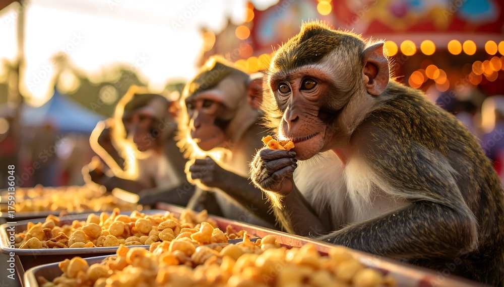 Fototapeta do Restauracji - A trio of monkeys enjoy a snack from trays of golden popcorn at an outdoor festival illuminated... #1759136048