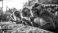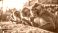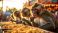 • A trio of monkeys enjoy a snack from trays of golden popcorn at an outdoor festival illuminated by the warm light