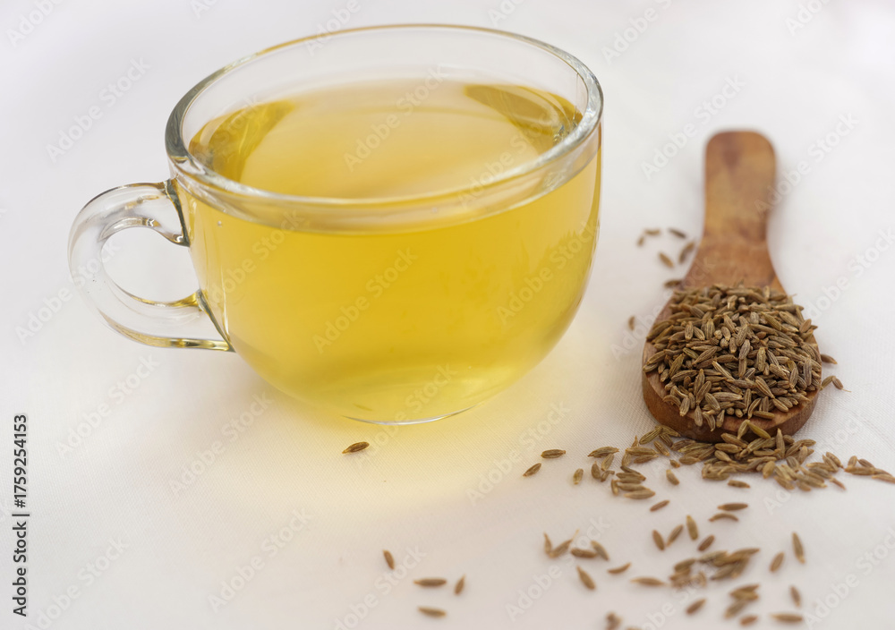 Fototapeta do Restauracji - cumin seeds and cumin tea and jeera water. Herbal tea alternative medicine background concept. #1759254153