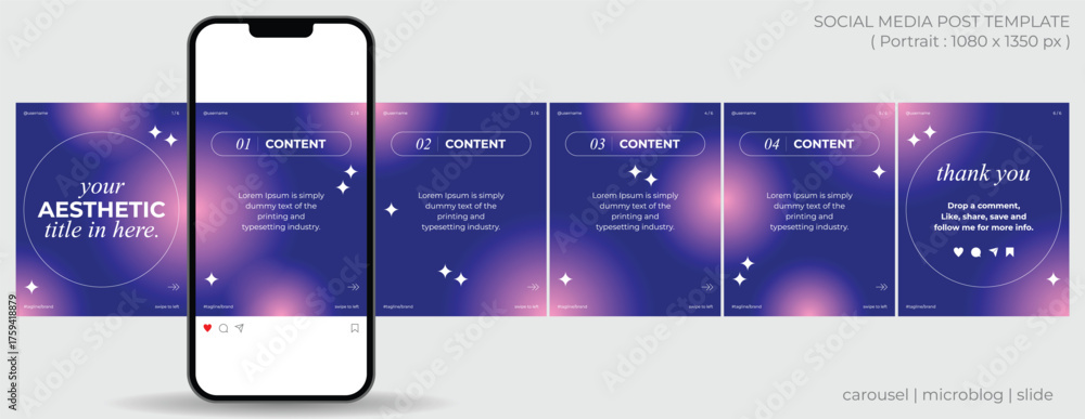 • Microblog or carousel post template design for social media. Six page in portrait frame, seamless, aesthetic style with dark blue and pink gradient color theme.