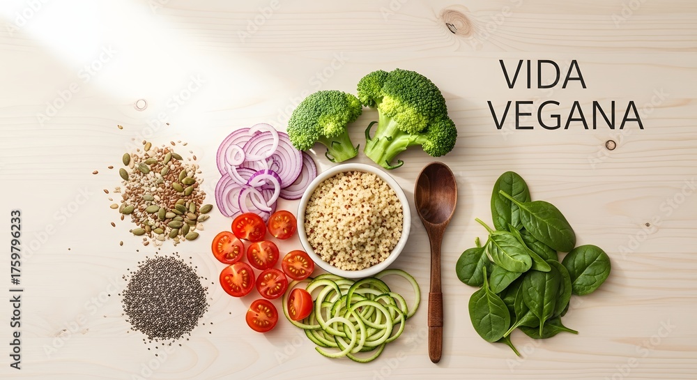 • Vida Vegana: A vibrant assortment of plant-based ingredients artfully arranged, celebrating the essence of vegan living and the natural bounty of fresh, wholesome foods.