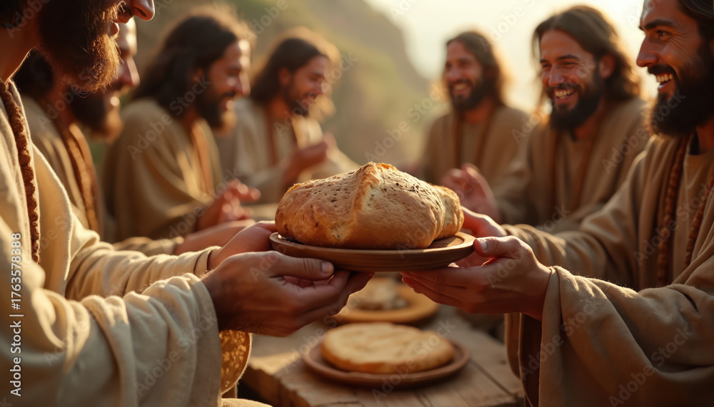 Fototapeta do Restauracji - Jesus shares bread with disciples. Men gather around rustic table for communal meal. Smile,... #1763578388