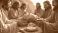 • Jesus shares bread with disciples. Men gather around rustic table for communal meal. Smile, laugh, showing unity, faith, spiritual community. Sacred moment brings nourishment, love, fellowship for