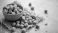 Fototapeta do Restauracji - Closeup of textured raw soya chunks piled in pink bowl. Vegan meat alternative scattered on... #1763879190