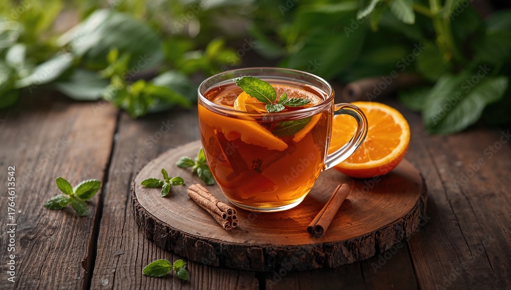 • Herbal tea infused with cinnamon, fresh mint, and citrus on a natural wooden surface