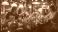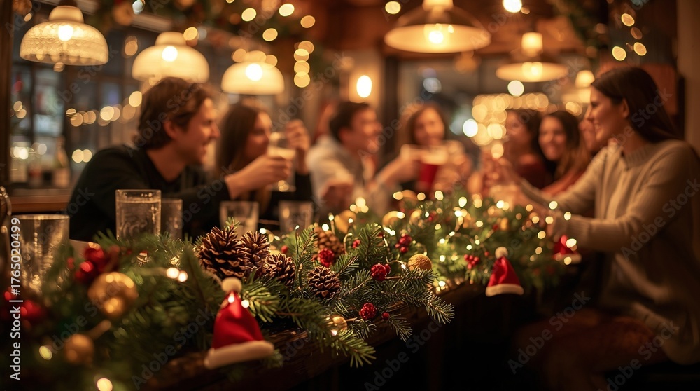 • Warm festive dinner with friends celebrating Christmas, beautifully decorated table with garland, pinecones and lights, cozy holiday atmosphere in restaurant or home interior