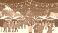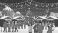 • Vibrant outdoor winter festival scene at dusk, featuring a decorated Christmas tree, snow-covered market stalls with festive lights, and diverse people enjoying the holiday atmosphere, with mountains
